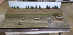 Don Hampton rebuilt the module in 2000 adding the buildings that are currently on the module today. He also replaced the hand-painted roads with manufactured road strips. When Don left the club in 2006, this module was given to Everett Owensby who eventually donated it to the club in 2016. George Barrier refurbished the module in 2018, replacing the damaged mainline tracks. He also made a few modifications such as adding an NTrak standard “orange” line for the train station, replacing the scenery in front of the main lines, and adding working lights to the sign and all the buildings.