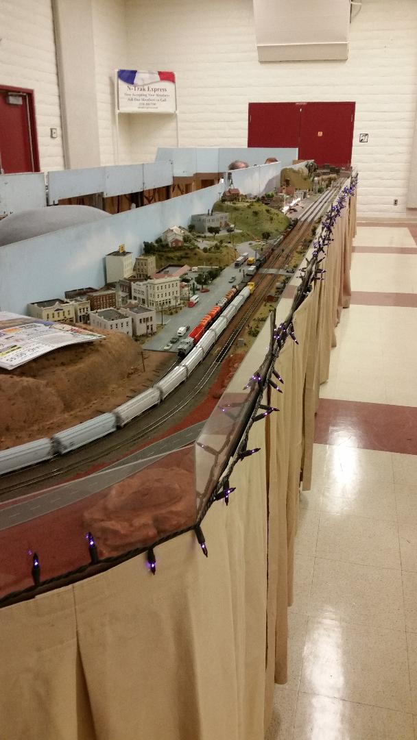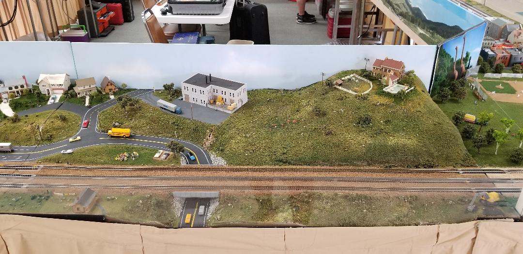 These modules were donated to the club in 2014. The country module features “snob hill”, a ritzy hilltop home complete with swimming pool. George Barrier refurbished them in 2019, straightening the frame to remove the dip in the main lines, patching cracks in the surface, and freshening the foliage with new material. George also made a few modifications such as replacing the wooden legs with metal legs, repainting the roads to include lines and crosswalks, adding overhead signal lights to the intersections, adding working lights in all the buildings, and adding thread to the power poles.