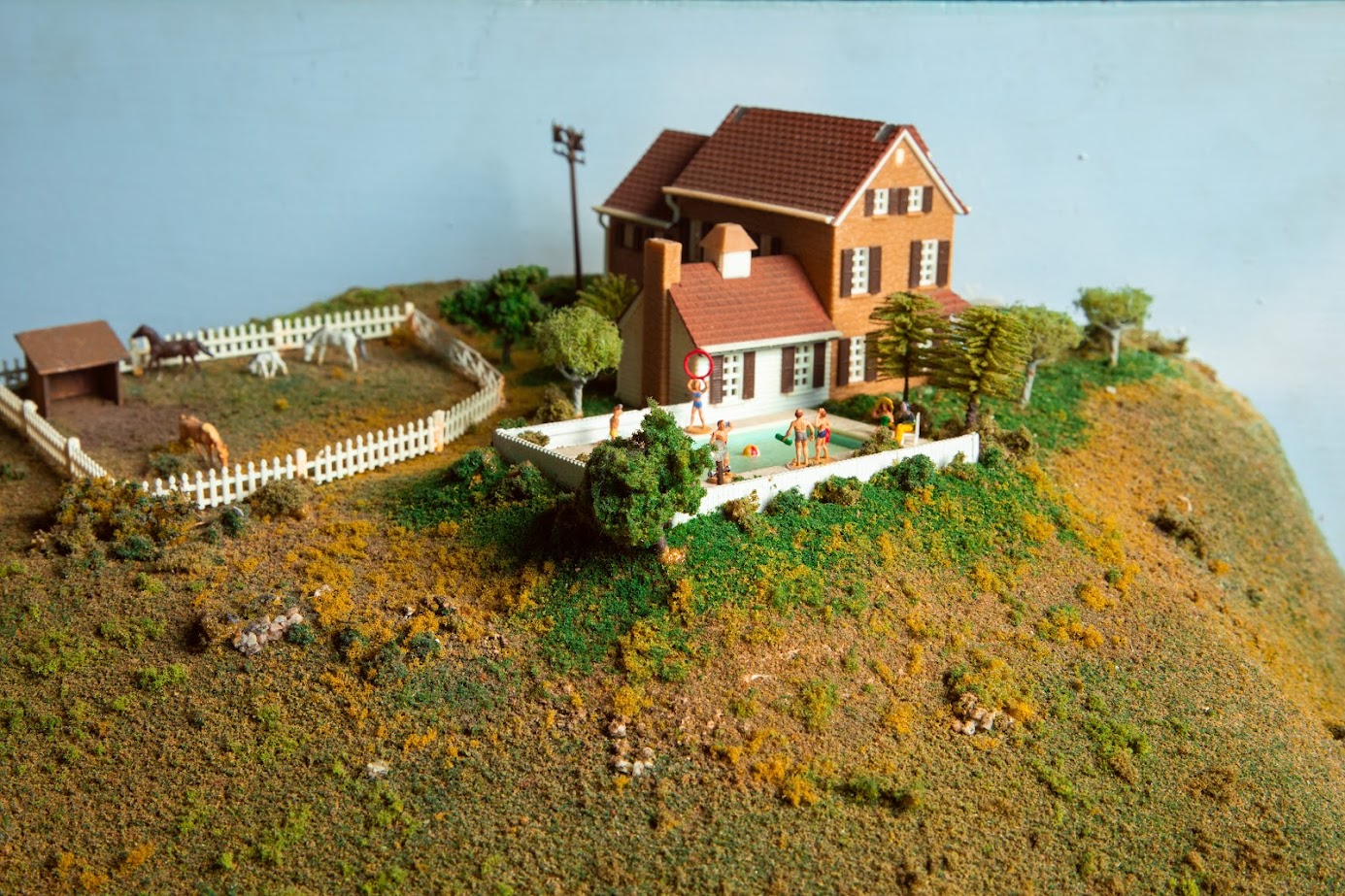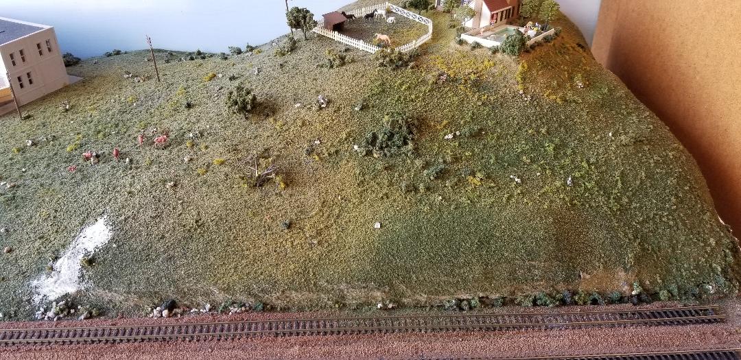 The faded greenery was not removed, but was instead covered by a thin layer of fresh material. This preserved the basic look and feel of the original scenery while giving it more vibrant color. Some additional yellows and greens were added to increase the color complexity. The inhabited areas were given a darker green color set to reflect a more manicured look.