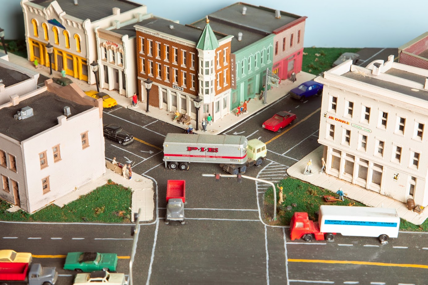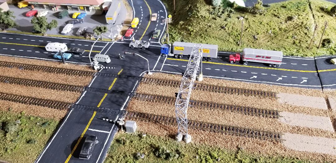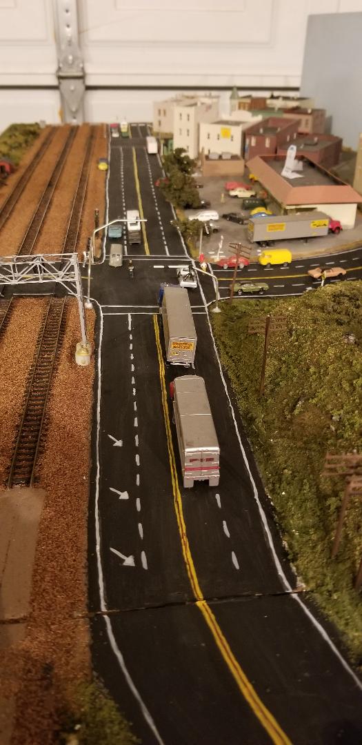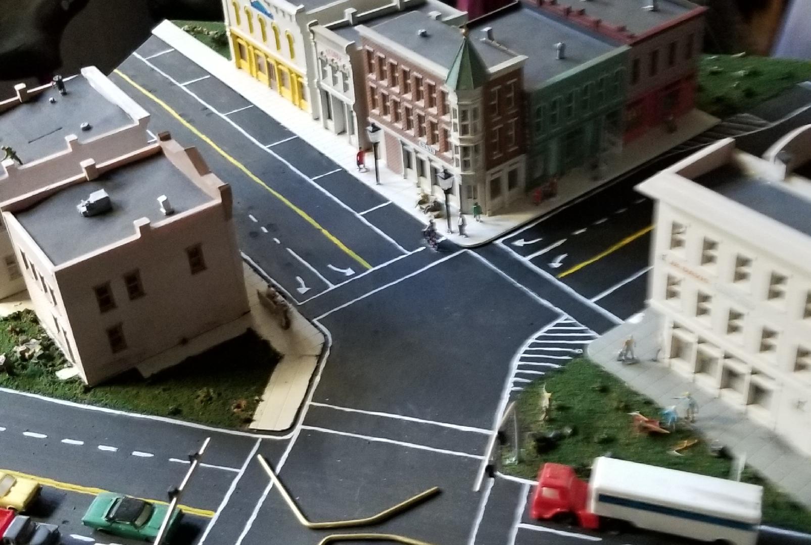 The west end of the city module has a very interesting intersection. The main highway follows the railroad tracks, but the city grid is turned at an angle. This complex intersection also received lines, crosswalks, and traffic signals for safety.