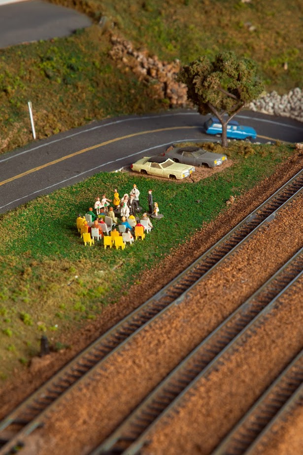 There is a small outdoor wedding happening right between the rural highway and the railroad tracks. It is not the most peaceful location with all the trains coming and going. This photo was taken by Amanda Barrier.