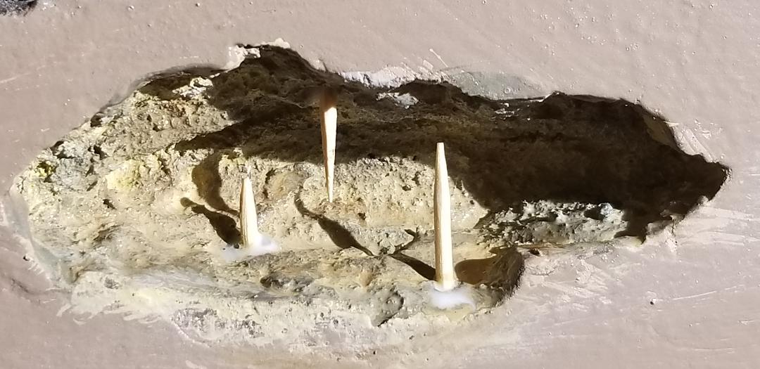 What was once thought to be just a scar in the mountain’s foam support is now starting to look like a cave. Some plaster is added to give the right texture. Some scenic paints of various rocky colors are also added starting with a light tan. Some yellow ochre and grey are lightly washed on to give some variety to the color. Toothpicks are glued into the floor to simulate stalagmite and to the ceiling to simulate stalactite.