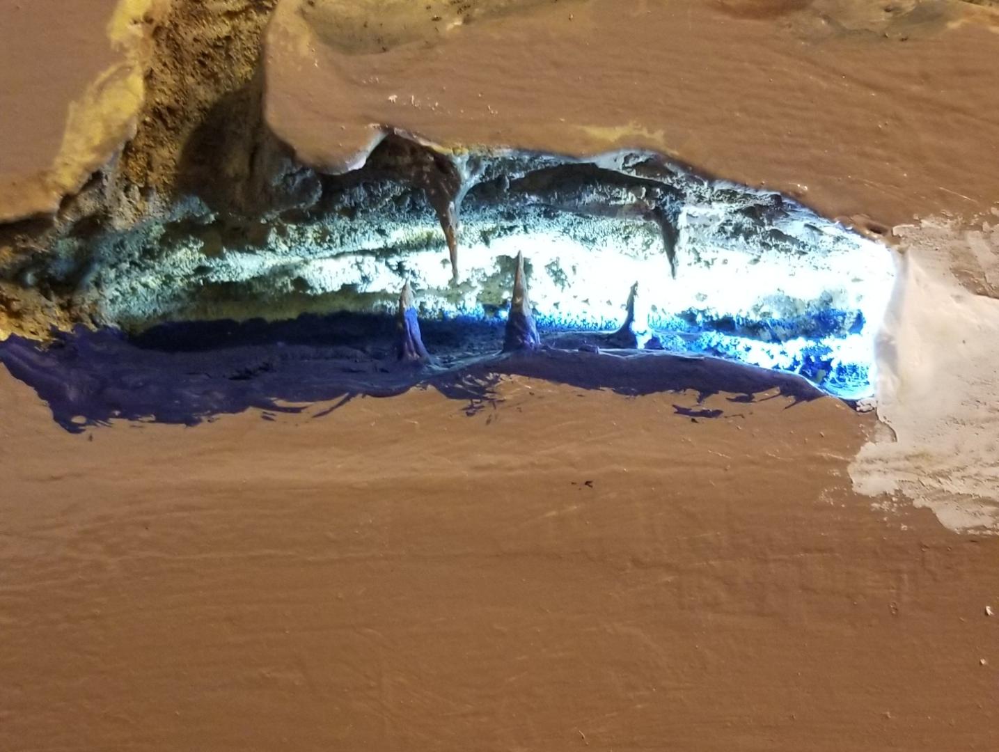 The floor of the lowest cave (there are 3 of them) is painted blue to give it a flooded look. The blue is coated in Glosscote Clear Finish to make it shiny like real water. Lights are added in the corners of the caves to bring more attention to them at shows. The only thing missing is the cave climbers (still looking for them).