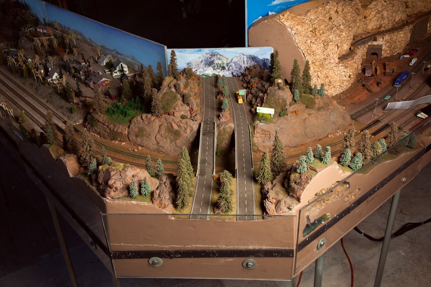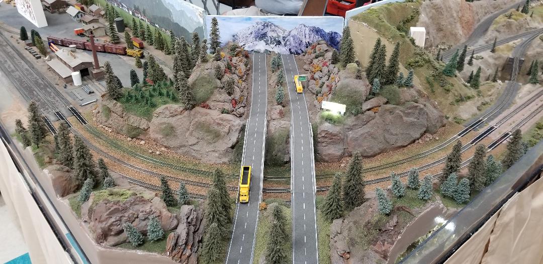 This module was donated to the club in 2006. It features shale rock outcroppings made using redwood tree bark. It also features viewable underground cave areas. George Barrier refurbished the module in 2018, replacing track ballast and trees that had fallen off with new ones. George also made a few modifications such as adding realistic cave colors and features and adding working lights to the sign and the caves.